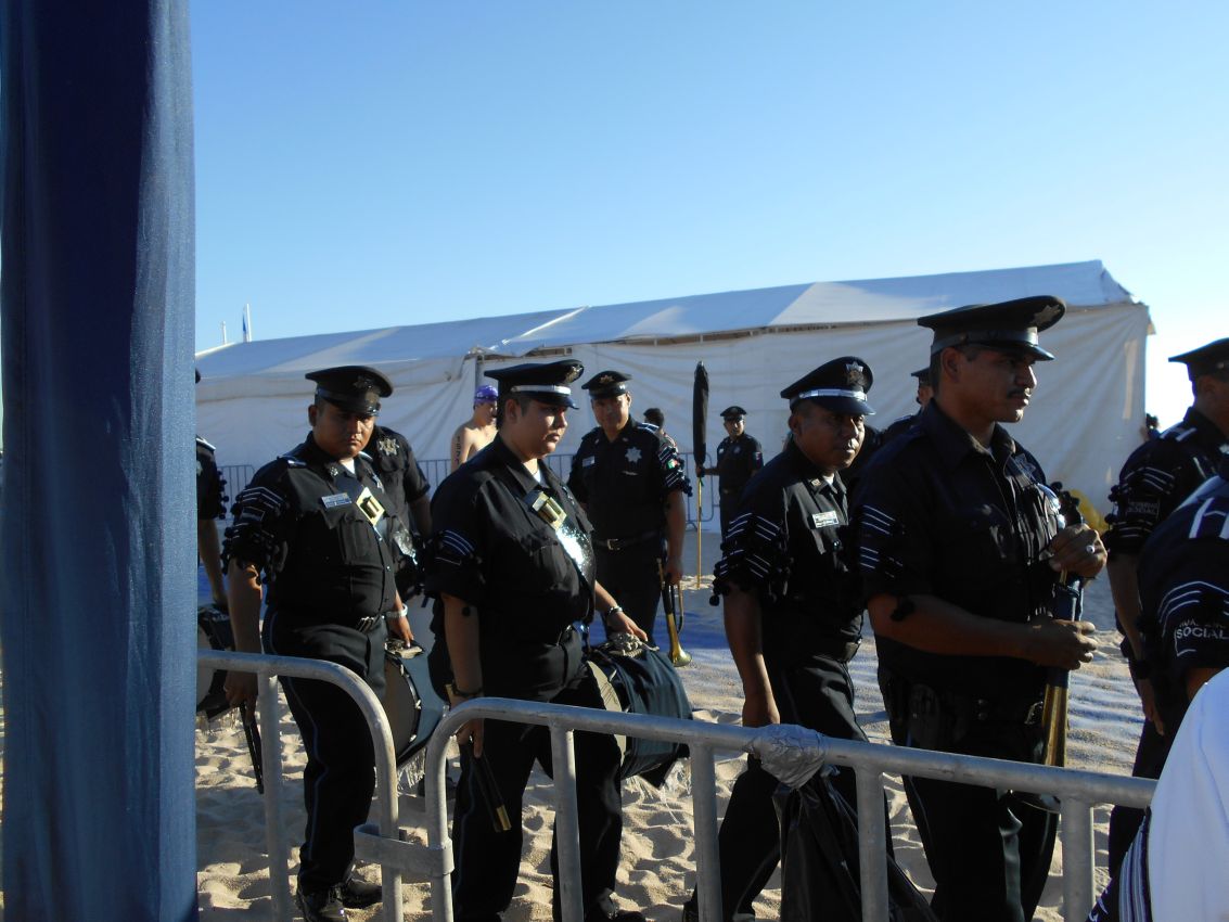 Vor dem Start der Langstrecke hat ein Polizeiorchester mit Trompeten einen