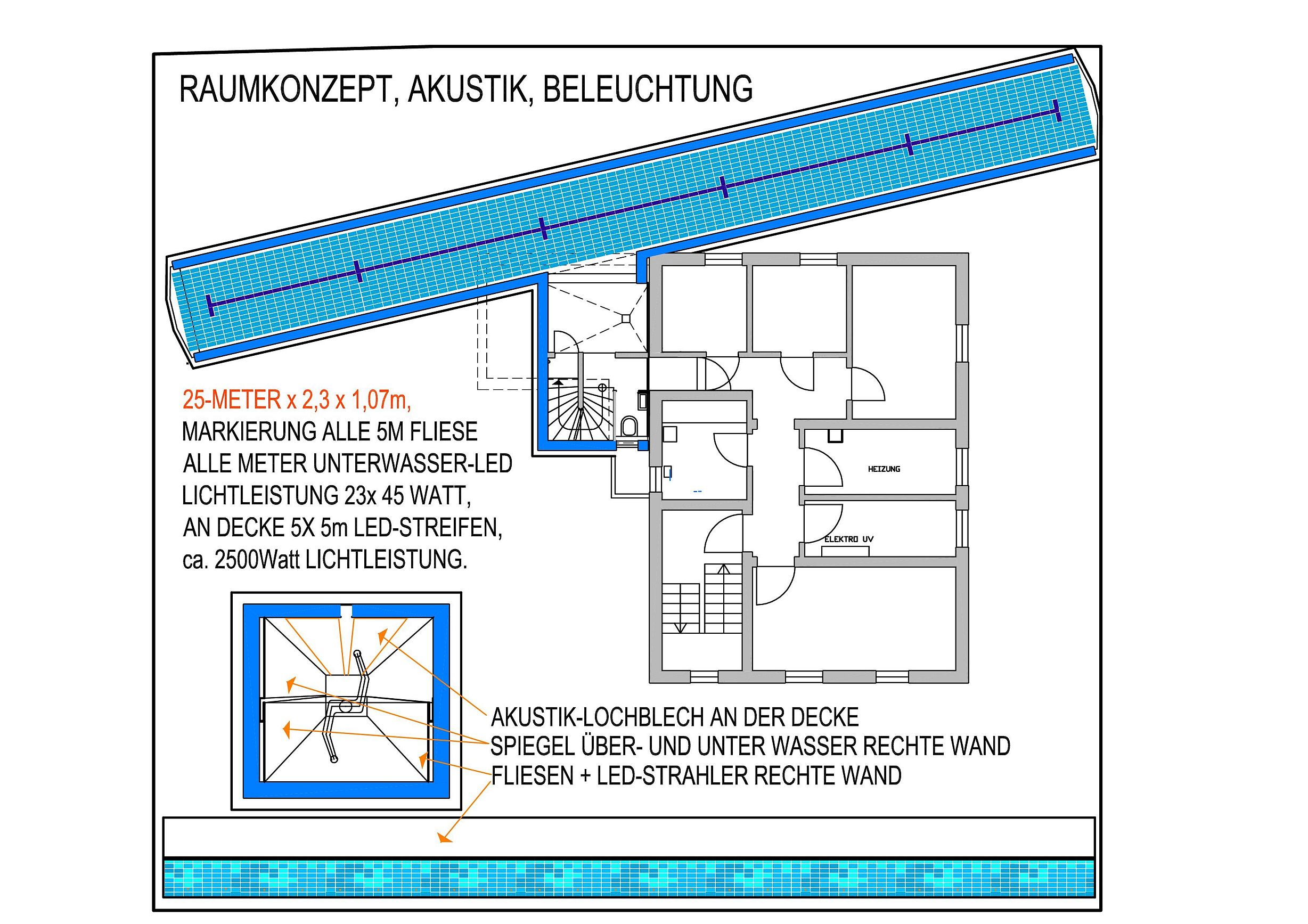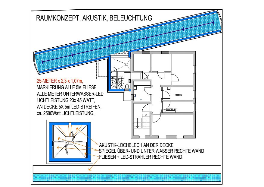 unterirdische Lage vermeidet gleich mehrere der gängigen Poolprobleme: Keine Veralgung durch infrarotes Licht, kein verdrecken durch hereinfallende Blätter und sonstigen Umweltdreck. Geringster Wärmeverlust durch sehr gute Dämmung. Kein begehbarer Beckenrand der geputzt werden müsste. Weitere Planungsdetails: - Verdoppelung des Raumgefühls durch Verspiegelung einer kompletten Langwand. - Ganz nebenbei kann hier auch der Schwimmstil selbst kontrolliert werden. - LED-Lichttechnik: 23 Strahler unter Wasser, Lichtleistung ca. 1000Watt! - 5 Deckenleuchtstreifen mit 2500Watt Lichtleistung, weniger als 250Watt Strombedarf. - V4A-Lochblech-Deckenbekleidung mit Mittelführung zur Verbesserung der Akustik. - Bodenmarkierung alle 5 Meter für Sprinttraining. - 3 Deckenlautsprecher für Hintergrundmusik. - Überlaufrinnen rechts und links für wellenfreies Wasser und gute Umwälzung. - Umwälzpumpe 3stufig mit frei einstellbarer Leistung und Mehrschichtfilter. - Desinfektion über Salzelektrolyse, komplette Technik im Nebenraum. - Wie bekommt man 25Meter Beckenlänge auf 24,7Meter Grundstück? Schrägstellen und V4A Edelstahlwendenden statt Beton heißt hier die Lösung! |